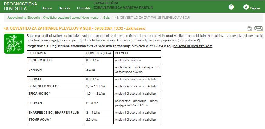 Aktualno zatiranje plevelov v soji najdete na povezavi: http://agromet.mkgp.gov.si/pp/Notices/Details?NoticeID=14242