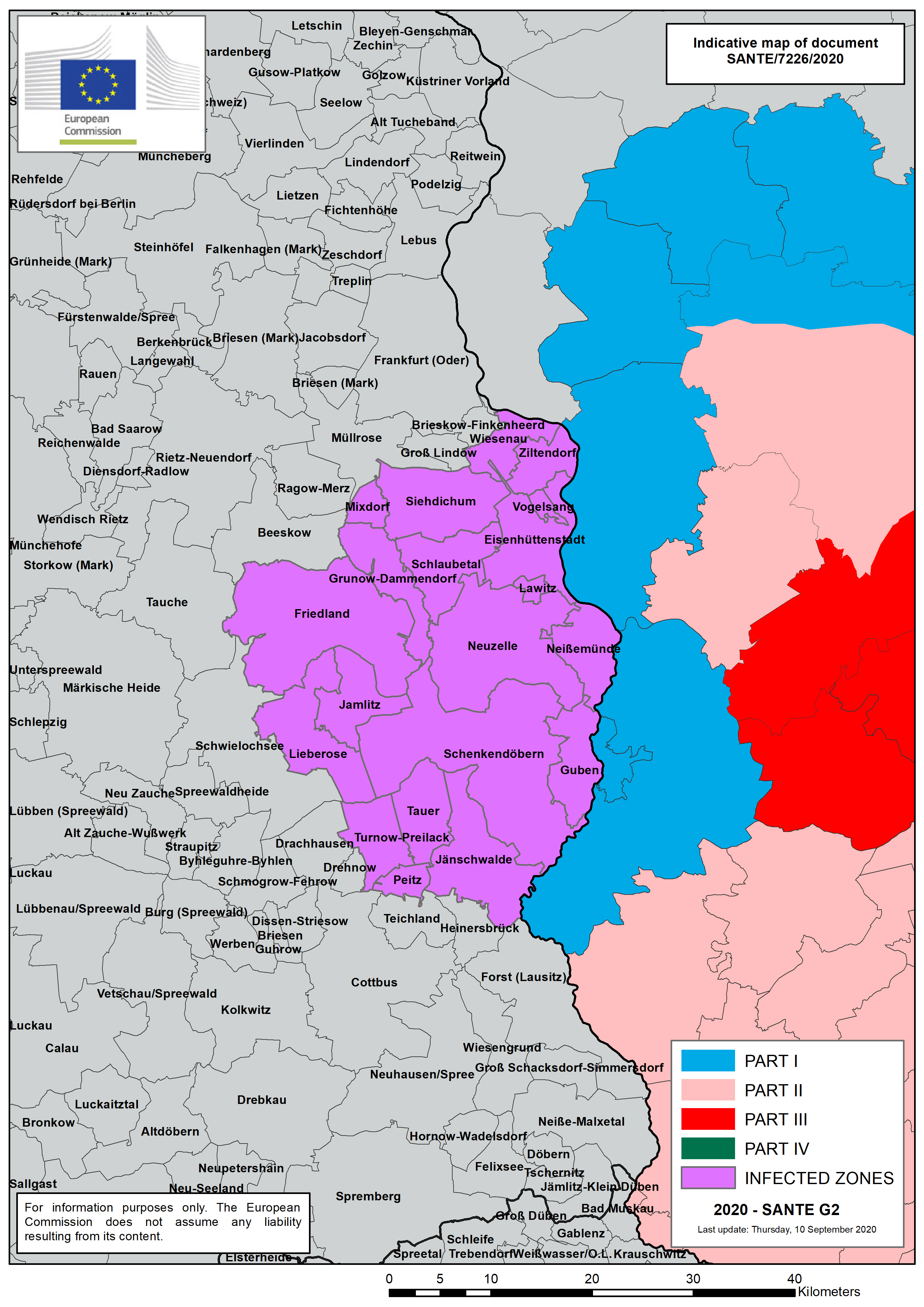 Na podlagi rezultatov preiskav na treh vzorcih tkiva oziroma kosti je državni laboratorij Berlin-Brandenburg 9. septembra postavil sum na APK. Nacionalni referenčni laboratorij Friedrich Loeffler Institute (FLI) je 10. septembra potrdil prvi primer APK pri divjih prašičih v Nemčiji. Epidemiološka preiskava s podporo strokovnjakov FLI še poteka.