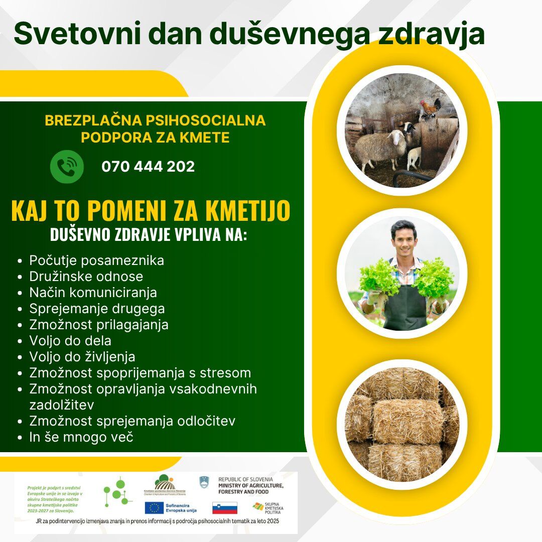 Duševno zdravje v kmetijstvu je ključnega pomena, saj vpliva na predajo kmetije, reševanje finančnih stisk, vzgojo otrok in skrb za ostarele ter preprečuje delovne nesreče. Večina slovenskih kmetij deluje kot družinsko podjetje, kjer morajo biti odnosi med člani urejeni in skladni, da delo poteka učinkovito. Poleg finančnih in administrativnih izzivov morajo zato kmetje skrbeti tudi za medosebne odnose, usklajevanje dela in prenašanje znanja med generacijami, kar je pogosto spregledana, a ključna dimenzija za obstoj in uspeh kmetije.