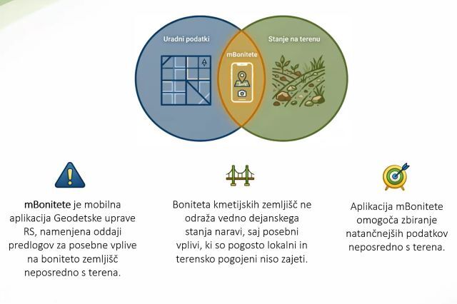 Z namenom izboljšanja kakovosti podatkov, povečanja preglednosti in večje vključenosti lastnikov zemljišč je Geodetska uprava razvila mobilno aplikacijo za oddajo predlogov za vpis posebnih vplivov bonitete zemljišč (mBoniteta). Aplikacija predstavlja sodobno digitalno orodje, ki omogoča neposredno in strukturirano posredovanje podatkov s terena v informacijski sistem Geodetske uprave.