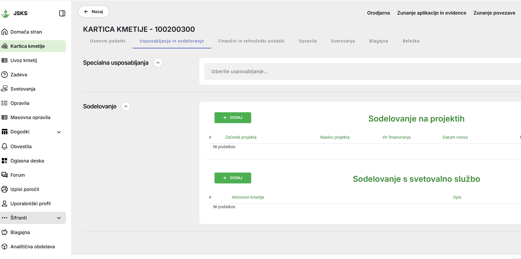 Osrednji del platforme predstavlja stran Kartica kmetije, ki z vpisom KMG-MID številke ali naziva nosilca, svetovalcu nudi vpogled v posamezno kmetijo. Na njej bodo zbrani vsi podatki, ki so deloma pridobljeni iz registra kmetijskih gospodarstev - RKG, deloma pa ročno vpisani v platformo. Vpogled v podatke kartice kmetije bo razdeljen na sedem zavihkov (osnovni podatki, usposabljanja in sodelovanja, finančni in tehnološki podatki, opravila, svetovanja, blagajna in beležka). Kartica kmetije bo med drugim vsebovala tudi seznam opravljenih svetovanj in povezana opravila ter račune.